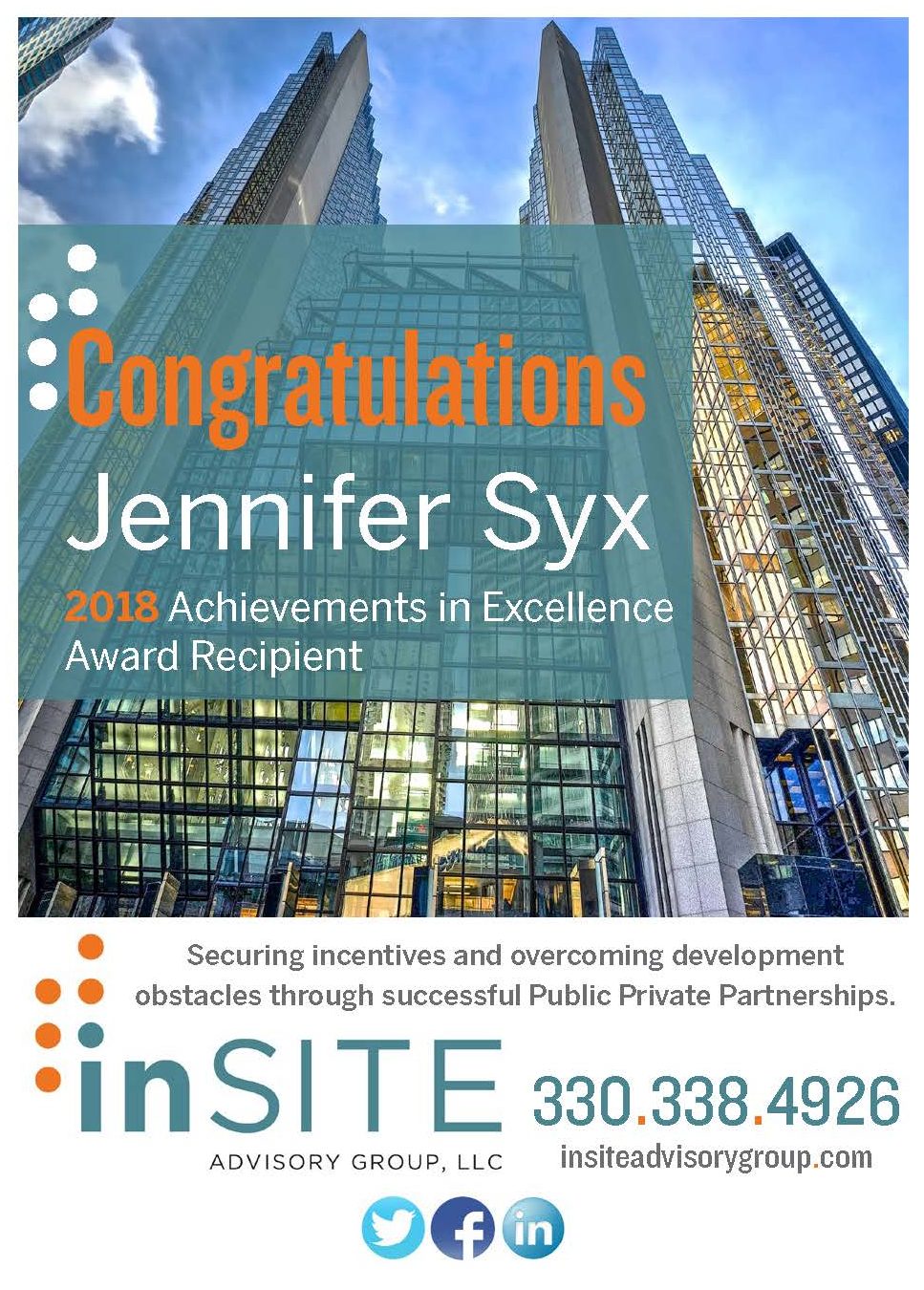 Business Wire – February 20, 2018 – Akron, OH – Jennifer Syx, President of inSITE Advisory Group, has been named a recipient of an “Achievement in Excellence” award by the National Sales & Marketing Executives (NSME) as part of their annual “Accent on Excellence” awards program, recognizing outstanding achievements by Sales and Marketing professionals in the Akron/Canton area.