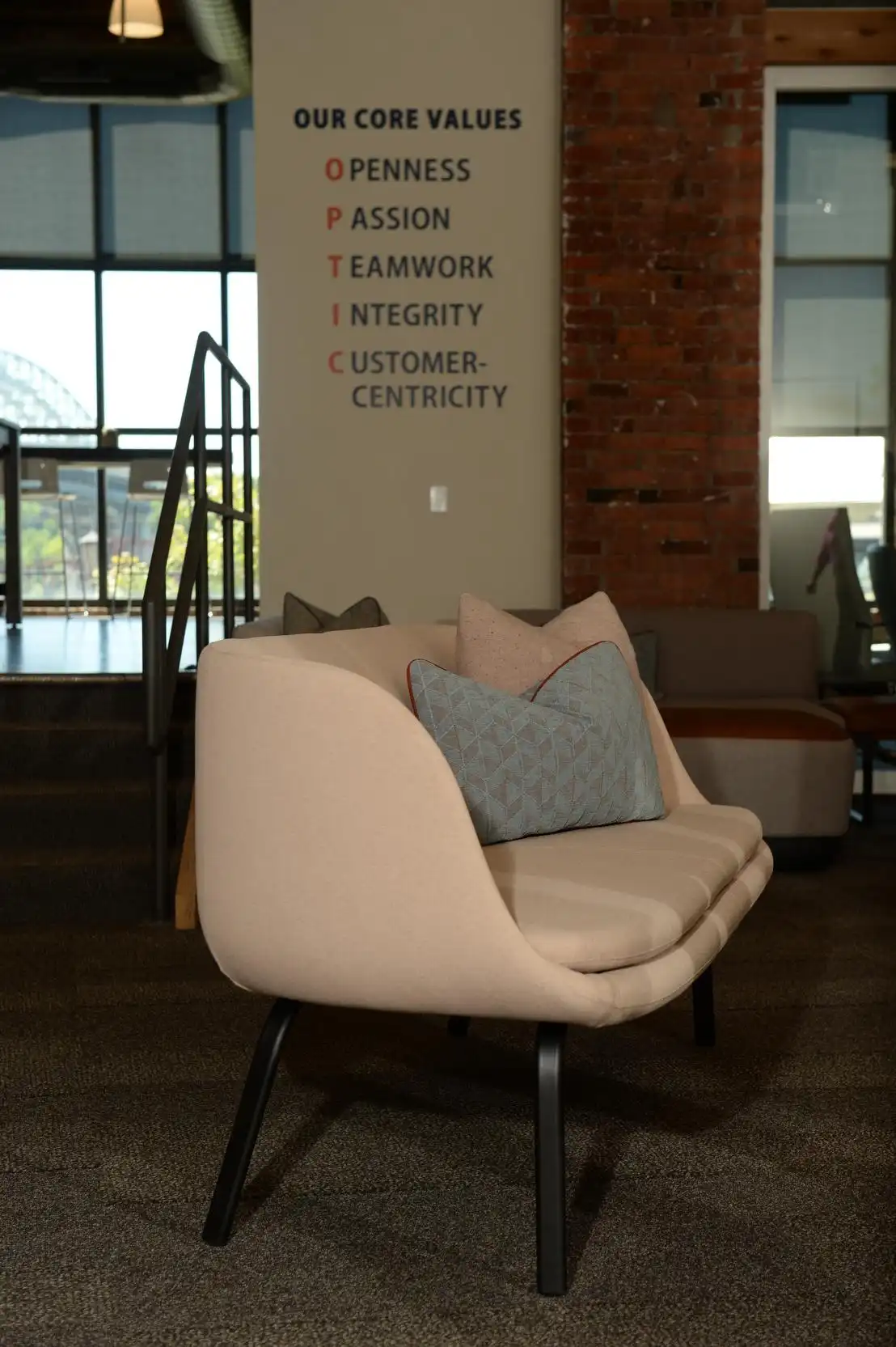Step inside the environments 4 business office showroom where the e4b crew work and play on display. This interactive showroom serves as a resource for clients including dealers, architects and designers, and features HNI furniture solutions displayed in a vibrant and historic atmosphere in downtown Cleveland. The open workstation layout in the 34,000 SF warehouse office, pops against the exposed bricks and beams. Take a seat in an Allsteel Acuity or EVO chair and you’ll be treated to a beautiful view overlooking the Cuyahoga River.