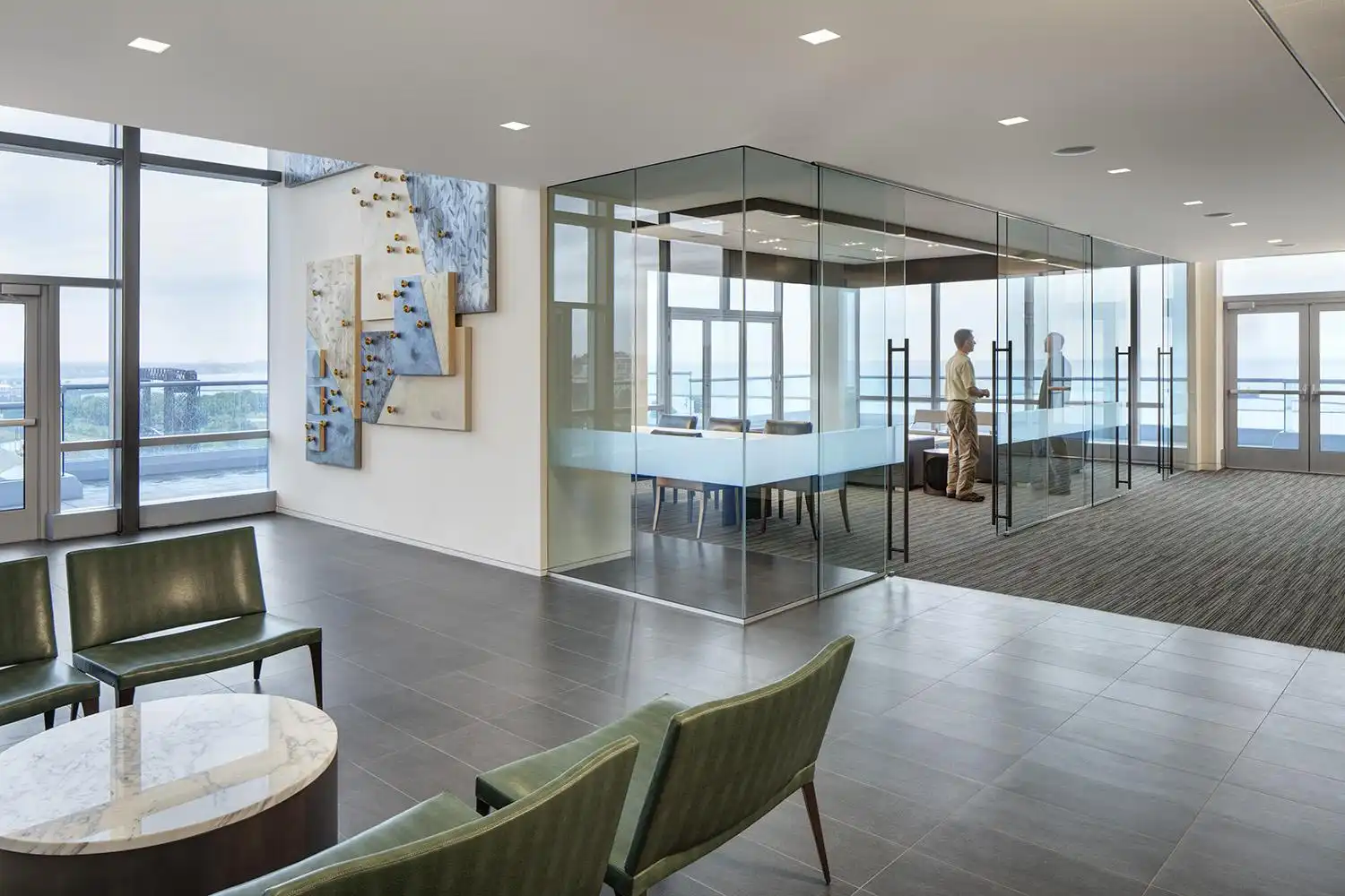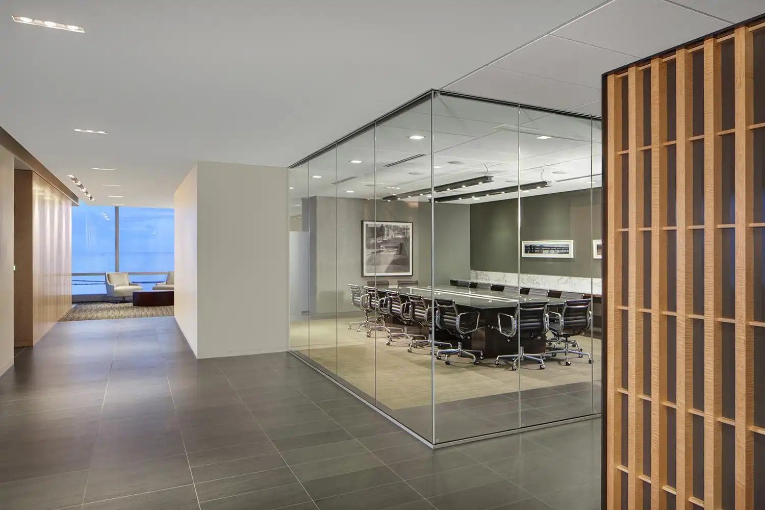 The firm selected office and conference room solutions from Gunlocke, long known for designing and producing fine-quality wood furnishings. Gunlocke Converge conference tables, featuring custom granite or glass tops, in several conference rooms, including a large, centerpiece table with a tapered granite top in a video conferencing center.