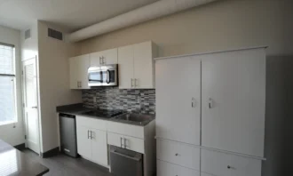 This new 38,000 SF building serves multiple purposes such as a pizza shop and two additional retail spaces within the 5,100 SF first floor. There are 52 units on the upper four floors, all ranging from 350 to 380 SF each. Each of the four residential floors have six one-bedroom apartments which range from 530 to 700 SF each.