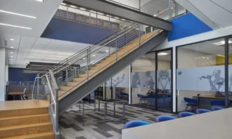 The project included 2 cafes, 12 offices at the lower level and 4 offices at the second level, 2 conference rooms, 1 board room, 32 cubicle workspaces, and 6 huddle rooms.