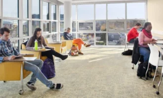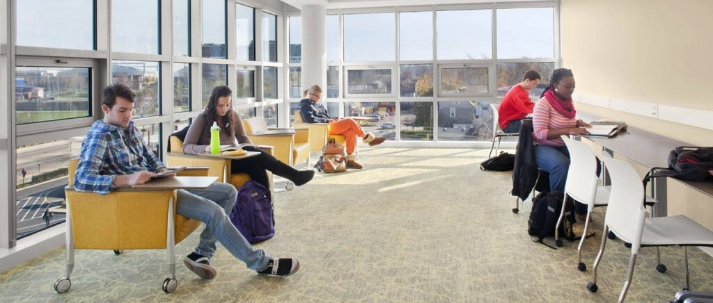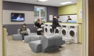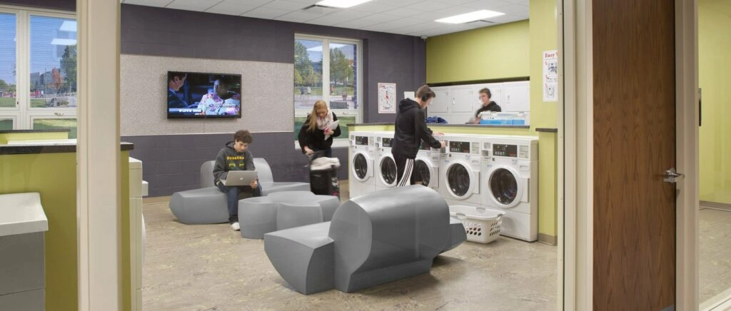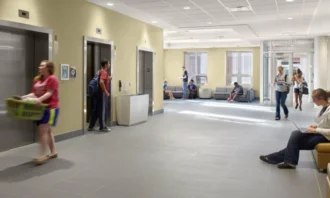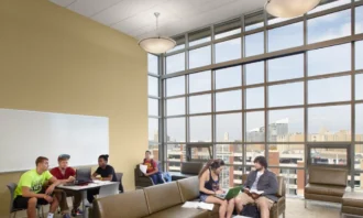 The project provides an excellent mix of shared/common spaces as well as an array of specialized living spaces that balance privacy and interaction with others. There are three basic unit types: a single-bedroom suite plan complete with living, dining and a kitchen; a double occupancy bedroom unit plan; and a plan with two single bedrooms with a common area. Each room style has its own in-suite bathroom, independent temperature control and high-speed internet connection. On every floor, there are two Resident Assistant apartments, study and lounge areas, and a free laundry that doubles as a socialization space with comfortable seating areas. Interior layouts, building systems, FF&E, and amenities are designed to be flexible and efficient. Commons, sit-down-dining, grab-and-go, student services, visible administrative offices, and multi-media rooms are located on the first floor.
