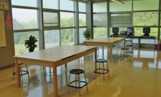 A new high school with every classroom towards the wooded view